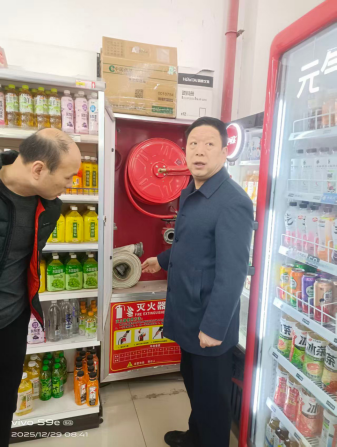 在后勤综合楼内进行消防检查,重点查看超市消火栓内消防器材配备情况,有无货物遮挡消火栓问题。